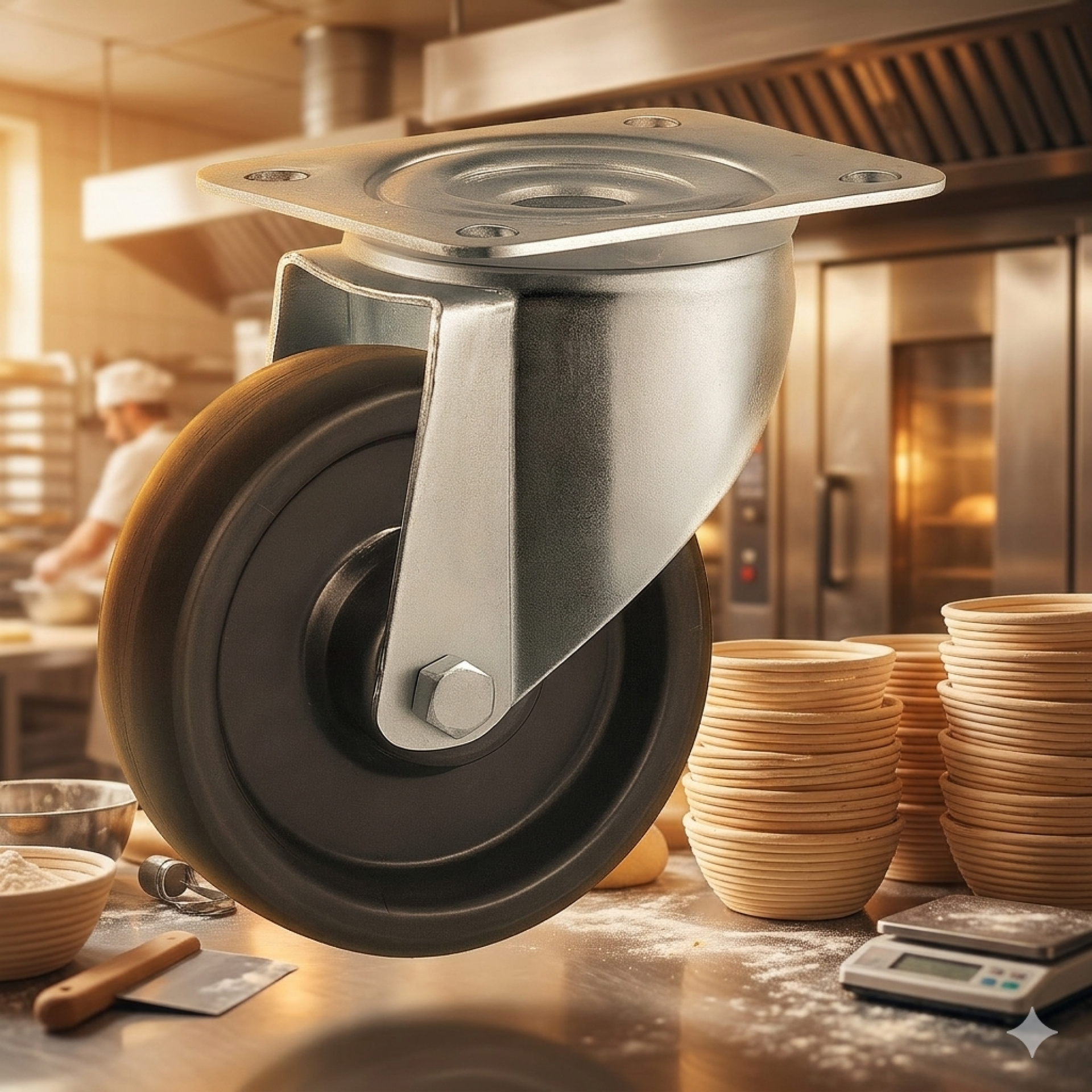 ตู้อบขนมปังมีอุณหภูมิสูงถึง 200–230 องศา รถเข็นถาดขนมที่ต้องเข็นเข้าออกตู้อบทุกวัน หลายรอบต่อวัน จำเป็นต้องใช้ล้อทนความร้อนเท่านั้น มิฉะนั้นจะต้องเปลี่ยนล้อบ่อยมาก และยังเสี่ยงต่อการปนเปื้อนสารเคมีจากล้อที่หลอมละลายลงในผลิตภัณฑ์